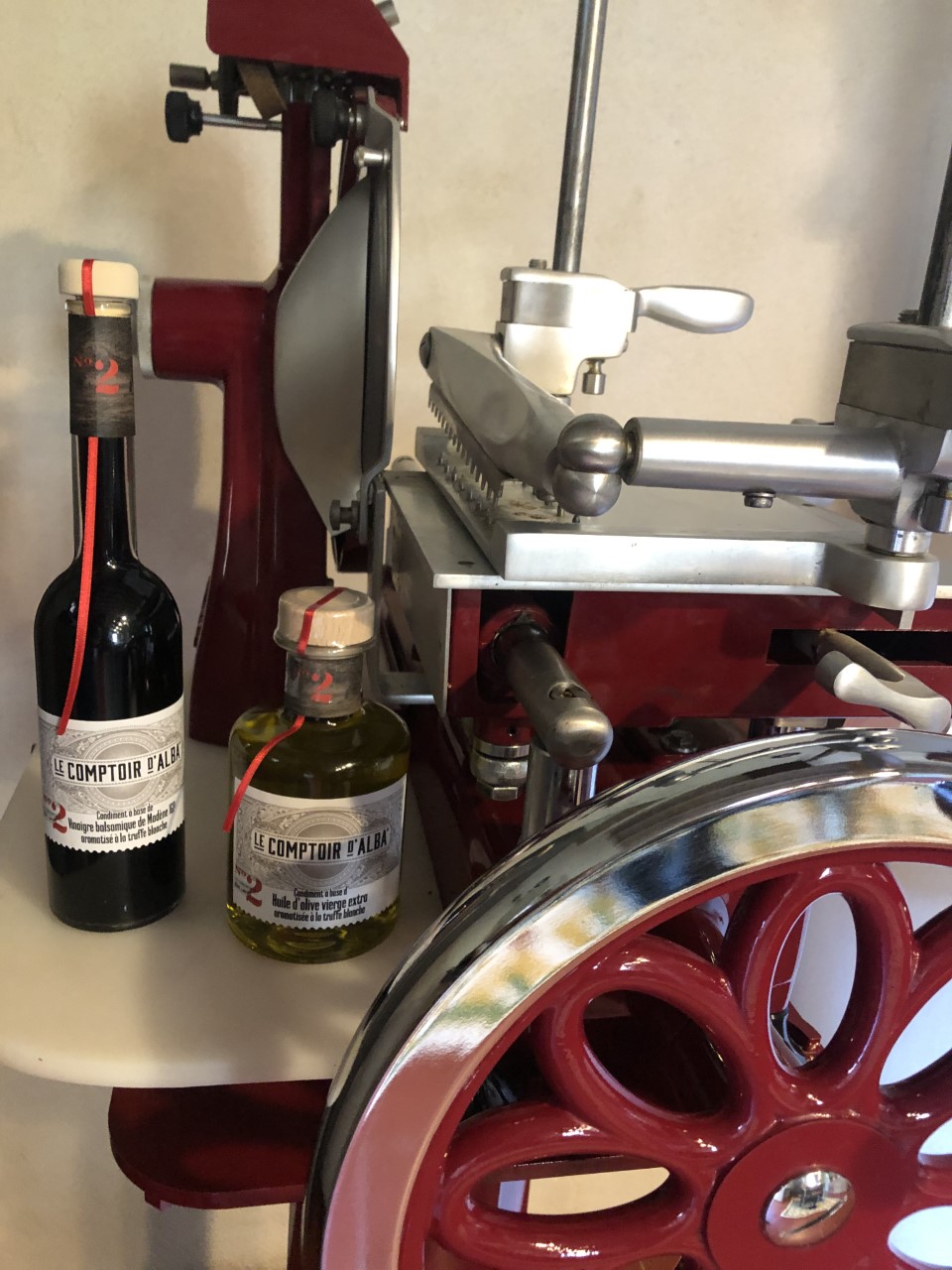 Panier gastronomique garni d’une huile d’olive aromatisée à la truffe blanche et d’un vinaigre balsamique igp modène aromatisé à la truffe blanche